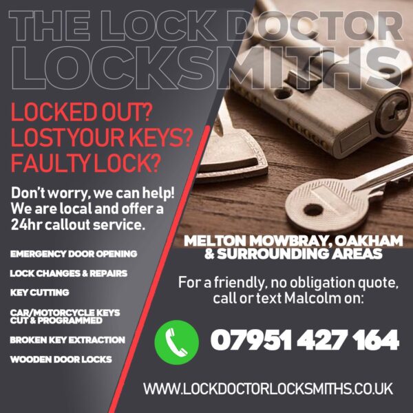 Hi, I am Malcolm the owner of Lockdoctor Locksmiths Melton Mowbray I am ready to assist with lockouts, lock upgrades, new homeowners lock changes and more. I never charge a callout fee and there’s no VAT to pay. Whether you need emergency or scheduled locksmith services, I cover 30-40 mile radius from LE13, delivering reliable affordable solutions with security as my top priority. For all your Domestic, Commercial, Auto Locksmith needs in Melton Mowbray and surrounding villages, contact Malcolm at Lockdoctor Locksmiths.